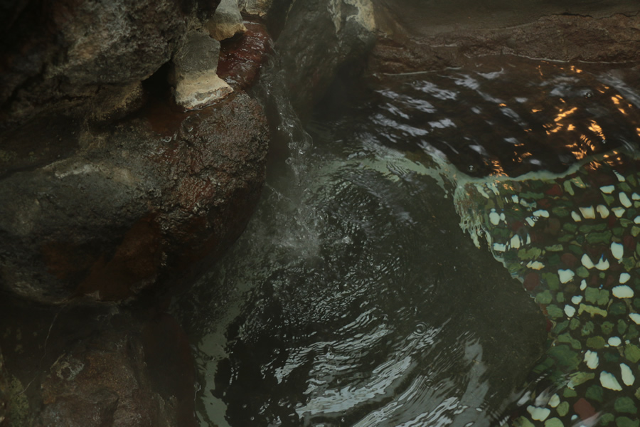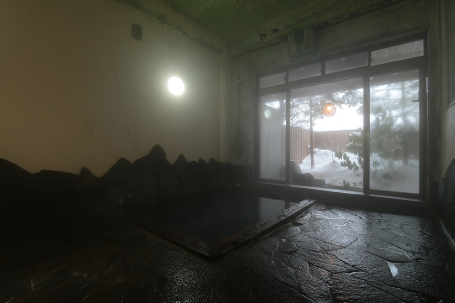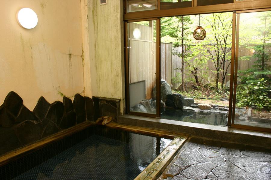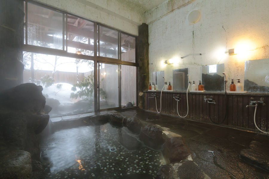 男湯の内湯は岩風呂になっています。 広々とした浴室は、大人数でもゆったりと入っていただけます。 大きな窓からそのまま露天風呂になっていて、四季を全身で感じていただけます。