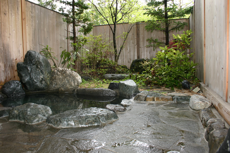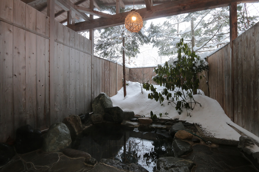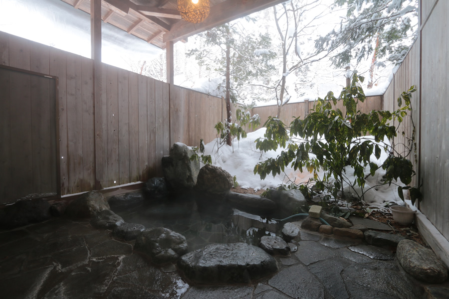 当館自慢の岩風呂・ヒノキ風呂をお楽しみいただけます。 露天風呂からは、満天の星空を眺めながら、 そして冬には雪見風呂と季節を通して表情を変える自然に包まれながらの入浴で、 日ごろの疲れを癒してください。